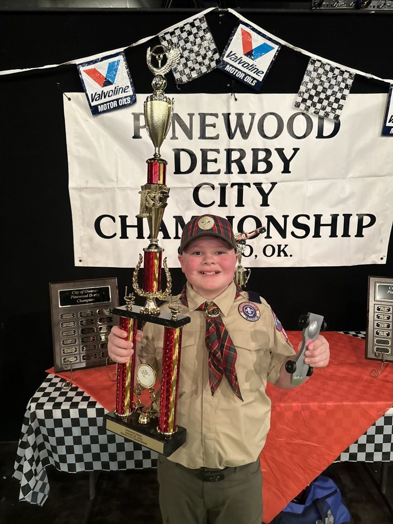 Cason is very proud to represent Pack 840 as the Grand Champion of the 2023 Owasso City-wide Pinewood Derby!